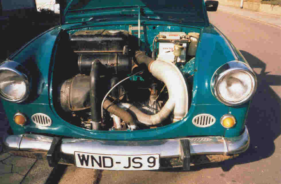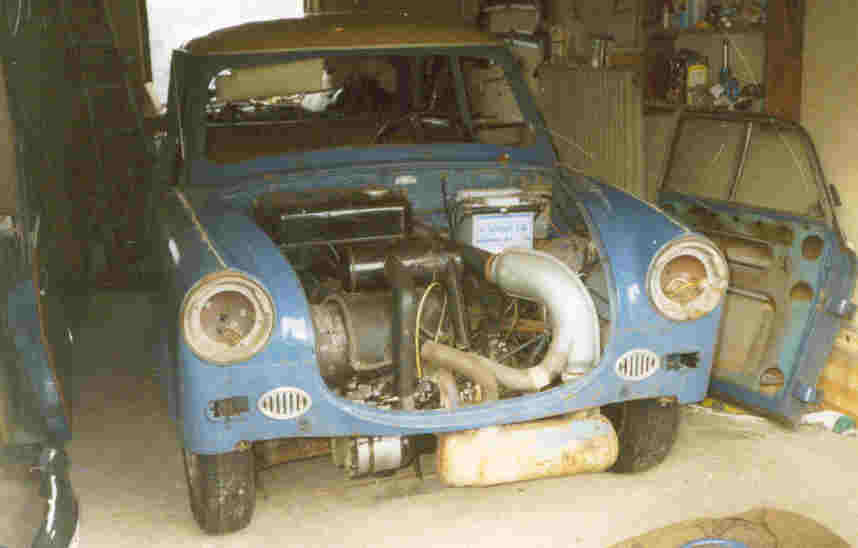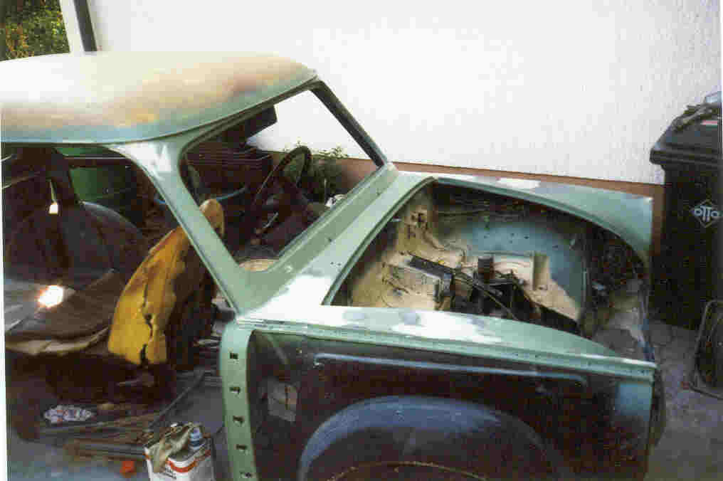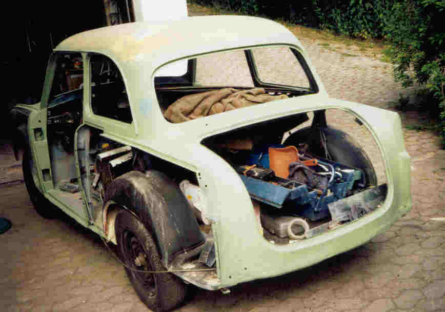 | Als ich im April 1996 den Trabant 500 gekauft habe, war ich von der guten Substanz überrascht. Ich war der Meinung, dass sich die Arbeiten weitestgehend auf eine neue Lackierung und den Einbau eines neuen Motors beschränken würden. Der Motor war -genau wie die Bremsanlage- fest und absolut unbrauchbar. Tatsächlich habe ich einen neuen bzw. anderen Motor einsetzt und die Bremsanlage komplett ersetzt. Gleichzeitig habe ich die elektrische Anlage auf 12 Volt umgerüstet und eine elektronische Batteriezündanlage verwendet. So konnte der Trabant nach einer provisorischen Lackierung (in weiss) und kleineren Sch(w)eissarbeiten vom TÜV abgenommen und zugelassen werden. Danach habe ich den Trabant komplett zerlegt und weitere Schweissarbeiten durchgeführt, ausserdem die Karosserie von diversen Lackschichten befreit und sandstrahlen lassen (das Sandstrahlen war die einzige Fremdarbeit!) Als Farbe wähle ich opalgrün aus. Ich weiss nicht wie tief mir das Kinn nach dem Lackieren gefallen ist. Der Trabant sah aus wie ein Karlsberg-Werbefahrzeug. Diese Farbe hat mir nie gefallen, darum habe ich im Jahr 2002 nochmals in azurblau lackiert. Das ist die Originalfarbe, in der der Trabant 1960 ausgeliefert wurde. Im Nachfolgenden gibt es eine Auswahl von Bildern vom Ablauf. Die Bilder beschreiben in keiner Weise die Arbeit und die Nerven, die mich das ganze "Projekt" gekostet hat.