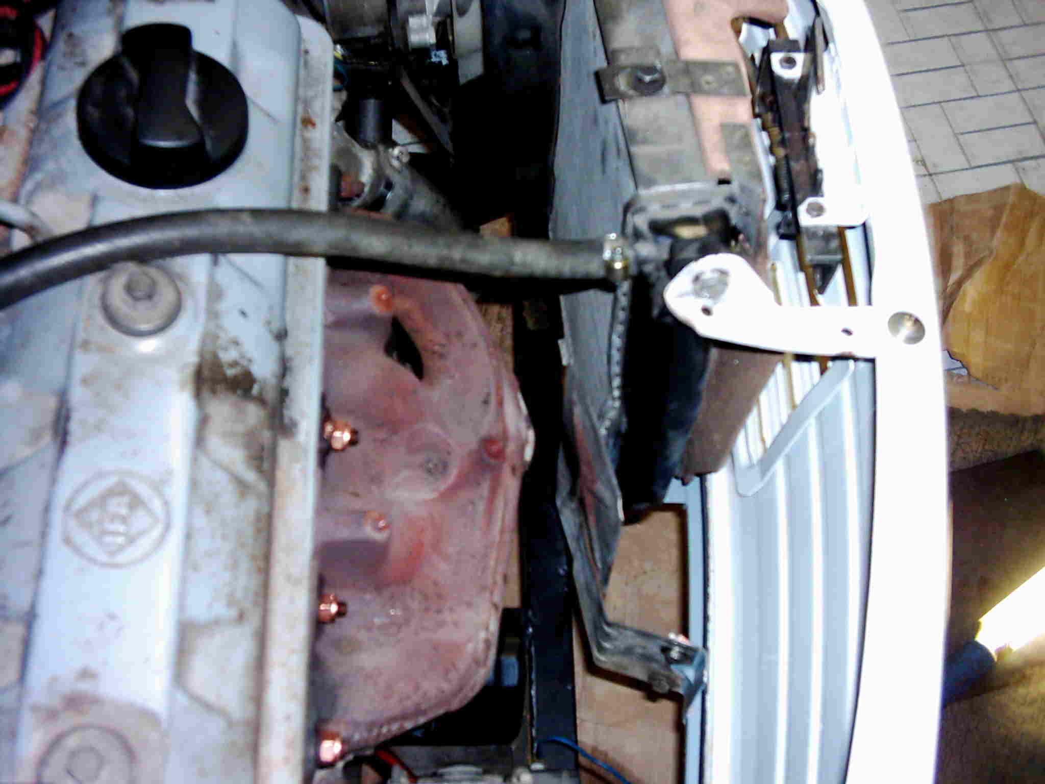 Man sieht: Der Platz zwischen Krümmer und Kühler ist eng! Der Wartburg-Krümmer baut zudem auch etwas weiter als der Trabant-Krümmer. Der Motor sitzt in der Motorlager-Aufnahme auf Anschlag hinten! |