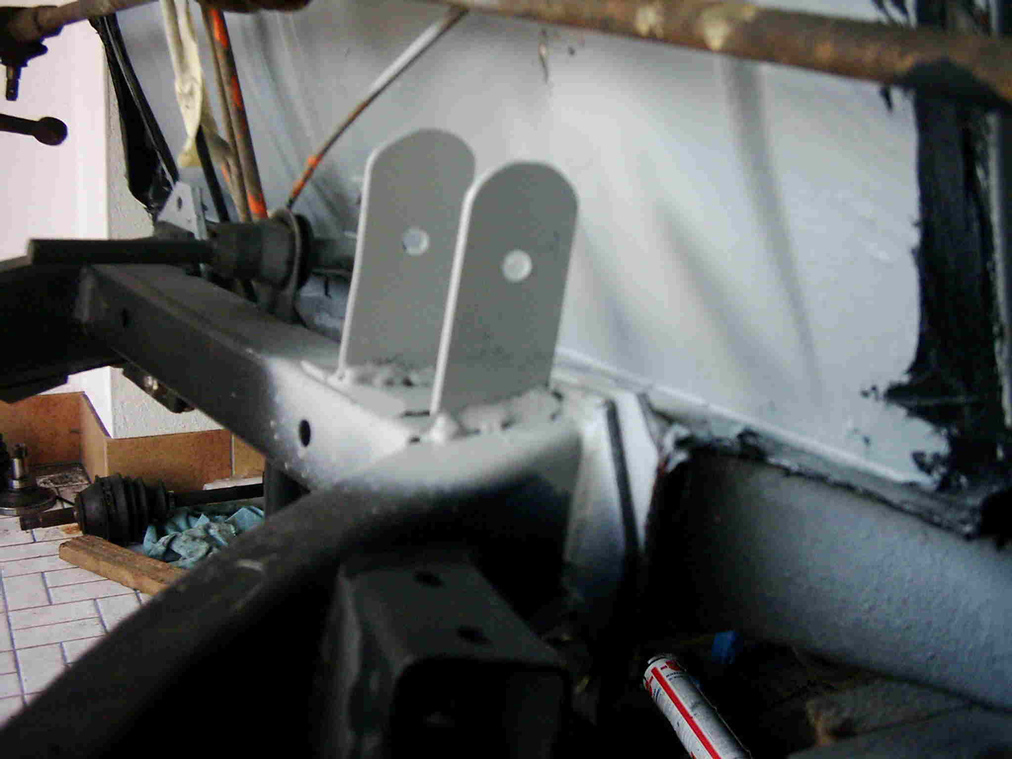 An der hinteren Getriebelageraufnahme muss das Getriebe so weit als möglich nach unten! Nicht wundern: Die Antriebswellen verlaufen leicht schräg nach hinten! Im Hintergrund sieht man das Führungsblech für das Schaltgestänge vom 601-Getriebe (angeschweisst) |
