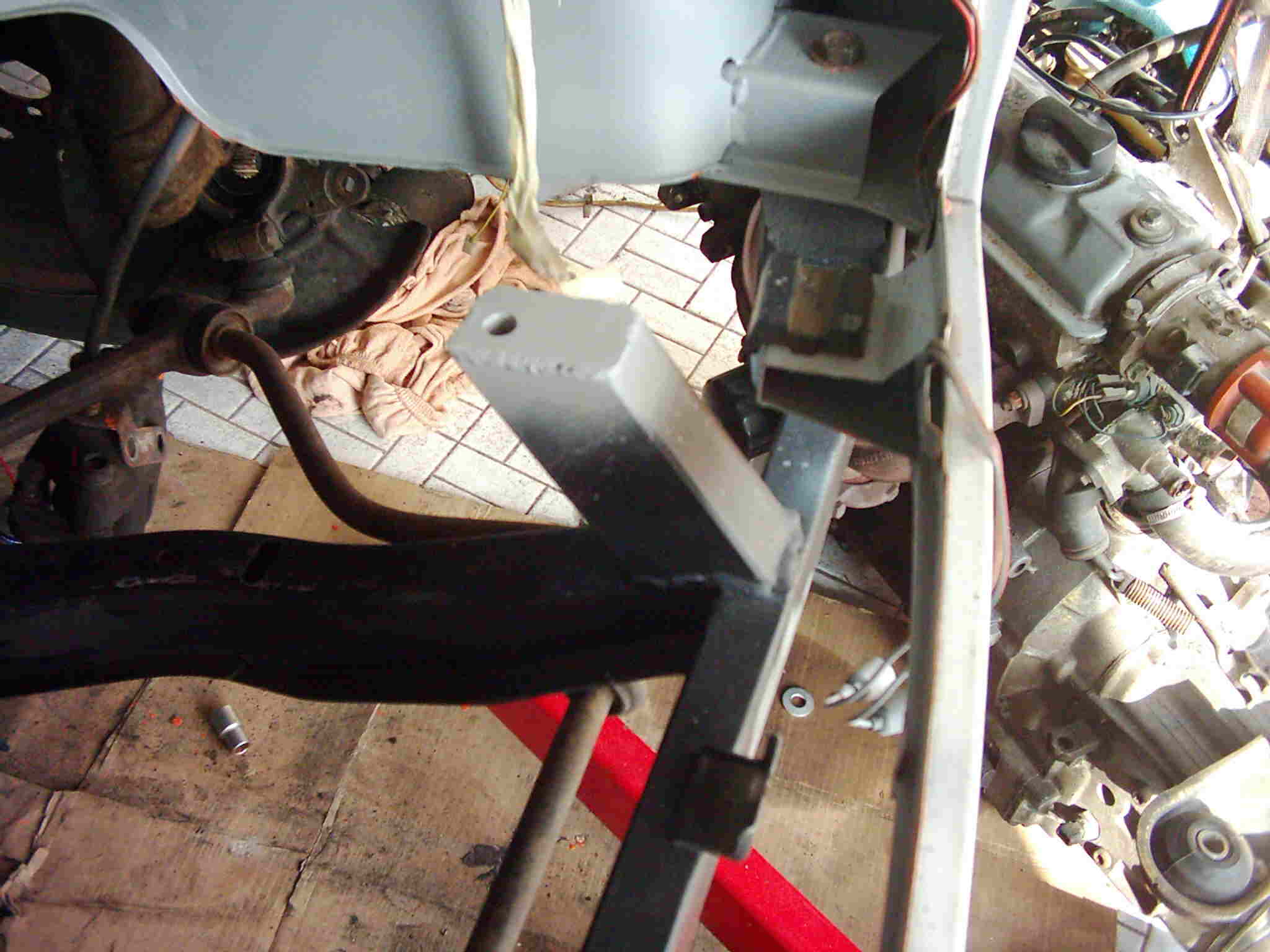 Zur Aufnahme des (Original-Polo) Getriebelagers habe ich ein Stück Vierkantrohr an den Hilfsrahmen angepasst. Das Loch für die Schraube ist aussermittig, das sonst später die Motor-Getriebe-Einheit nicht bei eingebauter Lenkung aus- und eingebaut werden kann. |