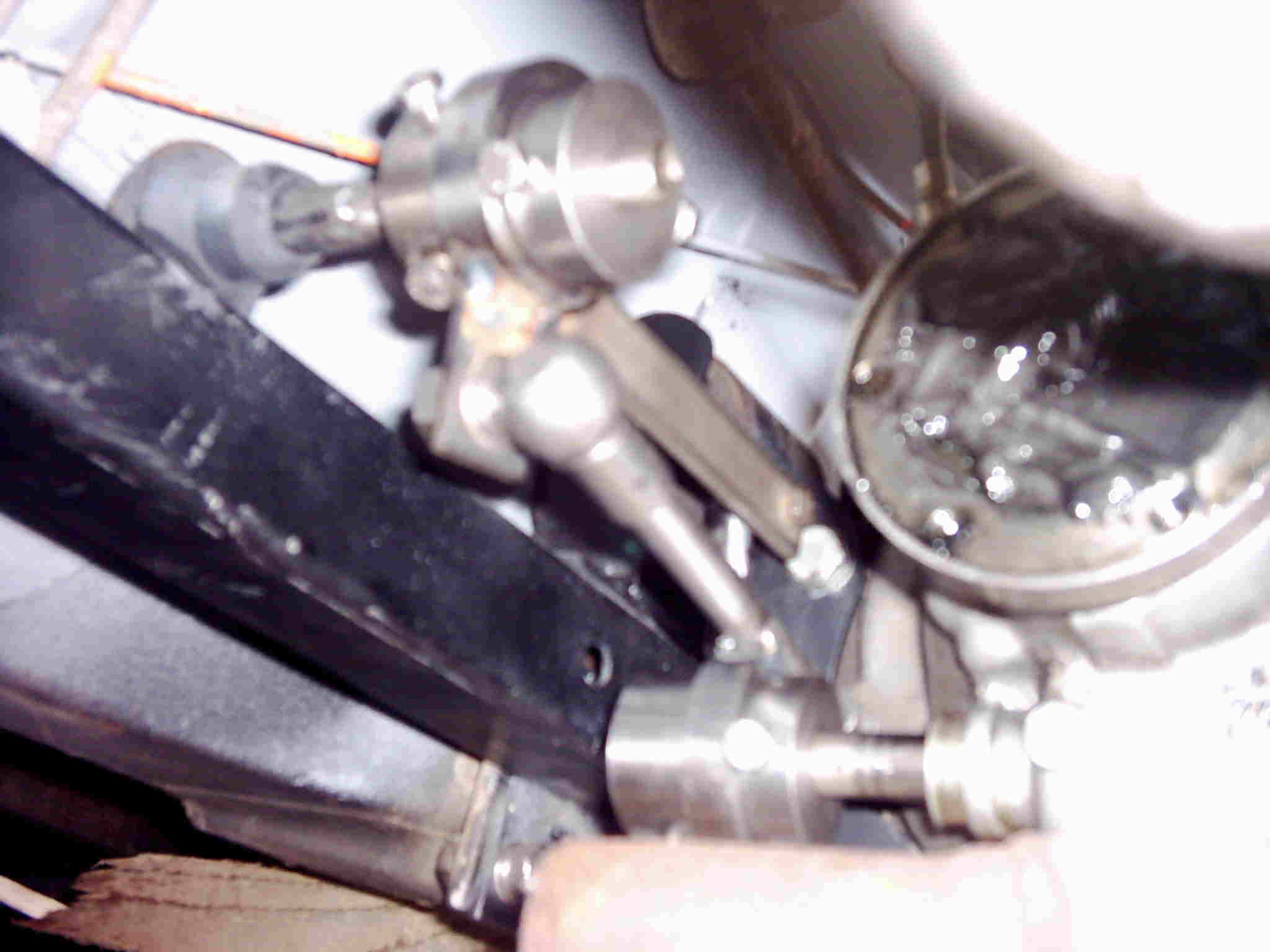 | Nicht in wenigen Sätzen zu erklären: Die Schaltung! Bei der Gangwahl macht das Gestänge eine Längs- und eine Drehbewegung. Da die Schaltstange schräg aus dem Getriebe austritt, muss ausserdem ein kleiner Längenausgleich erfolgen. Hierür hat mir ein Freund (Herzlichen Dank an den Georg!!) auf der Drehbank verschiedene Hülsen gefertigt, die jeweils auf das Rohr gesteckt bzw. geklemmt werden. In die jeweils innere Hülse ist ein Kugellager eingesetzt, das die Drehbewegung der Stangen ausgleicht und die Längsbewegung übertragen soll. Jeweils eine der auf den Stangen festgeklemmten Hülsen überträgt über einen angeschweissten Hebel die Drehbewegung. Dabei ist der eine Hebel länger als der andere, um eine kürzere Übersetzung zu erreichen. Damit der Beifahrer bei eingelegtem fünften Gang etwas mehr Platz hat. Zur Verbindung der beiden Hebel dient die Kugelgelenk-Stange vom 1,1er Schaltgestänge! Ich weiss nicht, ob diese Erklärung so direkt jemand versteht, aber ich will es zumindest versucht haben. *grins* |