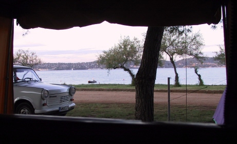Nach ca. 250 km und einem Streifzug durch Lipiza, wo die berühmten weissen Pferde herstammen, erreichen wir wieder Italien. Endlich ist es soweit: Der lang erwartete Blick aufs Meer! Wir rollen mit dem Trabant bergab mitten in das Strassengewirr von Trieste, zwischendurch immer mal wieder mit Blick auf den Hafen und die strahlend blaue Adria. es ist gar nicht so leicht, wieder aus Trieste in der richtigen Richtung heruaszufinden. Hier versagt mein Marcus-Navigationssystem. Mit ein paarmal verfahren klappt es aber trotzdem. Nicht weit weg ist auch die slowenische Grenze. Wieder ein paar Kilometer durch Slowenien, und wir erreichen Kroatien, unser heutiges Ziel. Auf dem Camping in Kanegra bauen wir auf, und geniessen den Strand in der warmen Abendsonne. Später noch nach Umag, das obligatorische Adria-Eis essen. Wieder ist ein schöner Tag vorbei....