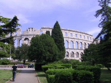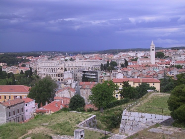 Auf dem Weg nach Pula verfahren wir uns, zum Schluss landen wir auf einer Schotterpiste und sind danach wieder an dem Punkt, an dem wir Porec verlassen haben. So kann es gehen, wenn man einmal vergisst abzubiegen. Nach gut 60km über kleine, kurvige Strässchen erreichen wir die Hafenstadt Piran. Hier steht das fünftgrösste Theater der Welt, ein relativ gut erhaltenes Amphitheater aus Zeiten der Römer. Am höchsten Punkt der Stadt steht eine Festung, von deren Turm man einen sehr guten Blick über die Stadt, den Hafen und über die ganze Bucht hat.