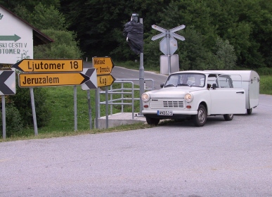 Wir lassen den Trabant stehen und fahren mit Andrej, wollen später mit dem Taxi zurückfahren. Slowenische Sprache ist schwere Sprache, und "Autocamp Jeica" schwerer auszusprechen als es sich liest. Andrej traut uns nicht zu, dass wir einem Taxifahrer erklären können, wo wir hinwollen. Er und die beiden anderen schreiben uns einige Zettel, und lachen sich halb tot dabei. Ich weiss nicht, wo wir da noch überall hingekommen wären :-) Irgendwann zwischen 0400 und 0500 morgens in einer mysteriösen Bar ist Andrej nach etwas zu grosszügigem Erdbeer-Wodka-Genuss nicht mehr wirklich "ansprechbar". Im Schnellkurs lerne ich, Fiat Tempra-"spezial" zu fahren, und darf uns alle zu ihm ins Studentenwohnheim fahren.
