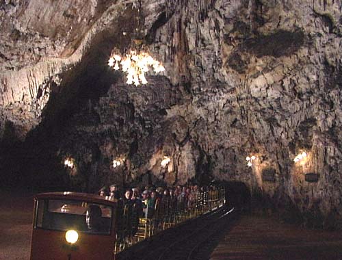 Donnerstag, 09.Juni 2005 - km 81577 Wie verlassen Kroatien wieder und fahren über die Autobahn ins slowenische Postojna, um dort die unterirdischen Karst-Höhlen zu besichtigen. Autobahnfahren in Slowenien ist richtig teuer, kostet ca. 8€ für 100km. Auch der Eintritt in die Höhlen ist teuerer als erwartet, 3590 SIT (ca. 16€) ist schon eine schöne Summe für Tropfsteinhöhlen. Auch der Parkplatz will nochmal extra bezahlt werden. Dafür ist es aber ein echtes Erlebnis, erst geht es mit der Elektro-Eisenbahn ca. 2 km weit unter die Karstlandschaft. Dort wartet schon ein Führer, der uns in Deutscher Sprache einige Kilometer durch die Unterwelt führt.