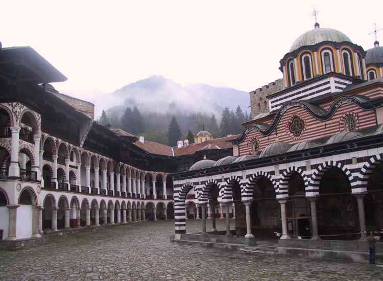 Beim Aufstehen hat es aufgehört zu regnen und es tropft nur noch aus dem Baum, unter welchem wir stehen. Das Frühstück fällt aus, und wir besichtigen das nahegelegene Rila-Kloster.