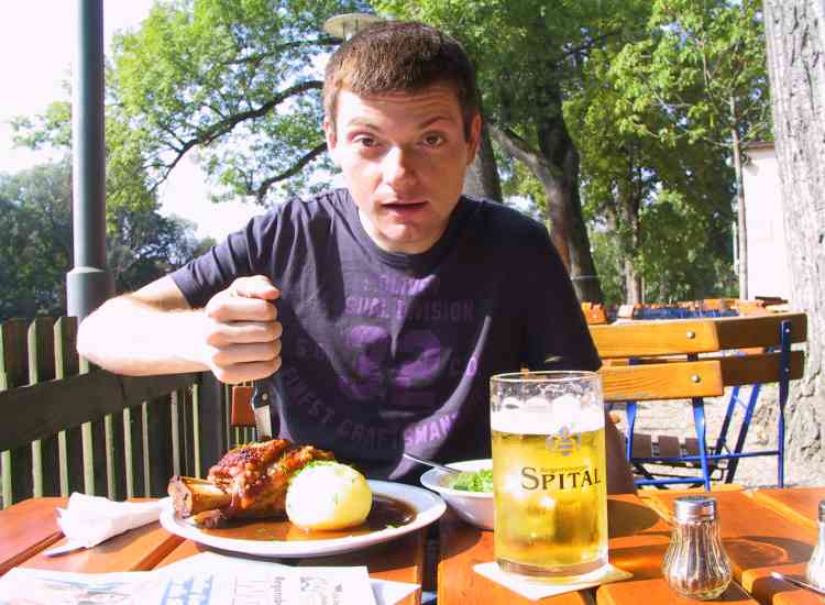 Samstag, 19.September 2009 Heute steht noch Regensburg auf dem Programm. Sascha möchte die Stadt besichtigen, ich kenne die Stadt schon von einem meiner letzten Service-Einsätze von Mahr. Beim Spital fallen wir bei bestem Wetter im Biergarten ein, um uns für die anschliessende letzte Etappe mittels Schweinshaxen mit Sauerkraut und einem halben Mass Dunklem zu stärken.