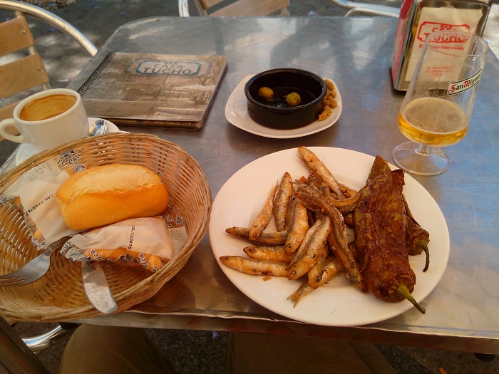 Am Abend treffe ich Alberto zum Essen in einer Tapas-Bar. Ich weiss nicht so richtig was ich bestellen soll, also erteile ich ihm den Auftrag, was Gutes für mich auszusuchen. Eine Spezialität von Sevilla bestelt er für mich.
