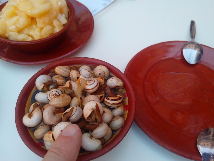 Zu dem Zeitpunkt habe ich noch keinen schimmer was das sein könnte, bis der Teller mit feinsten Schnecken vor mir steht. Erstes Problem: Wie bekomme ich die da raus? -Die Lösung: mit einer Art Zahnstocher rausziehen, Alberto macht es mir vor. So richtig sicher bin ich mir noch nicht, ob ich das überhaupt essen sollte.